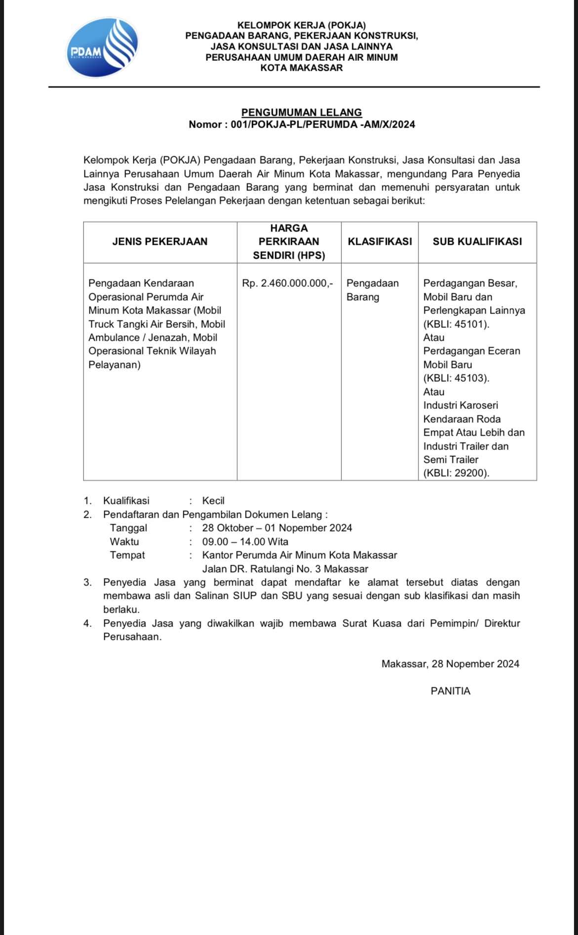Senin, 28 Oktober 2024. Perumda Air Minum Kota Makassar yang menanggapi permohonan dari Pemerintah Provinsi Sulawesi Selatan terkait pinjam pakai lahan guna mendukung pembangunan Instalasi Pengolahan Air (IPA) Mamminasata. Lahan tersebut berlokasi di daerah IPA V Sombaopu Kabupaten Gowa dan